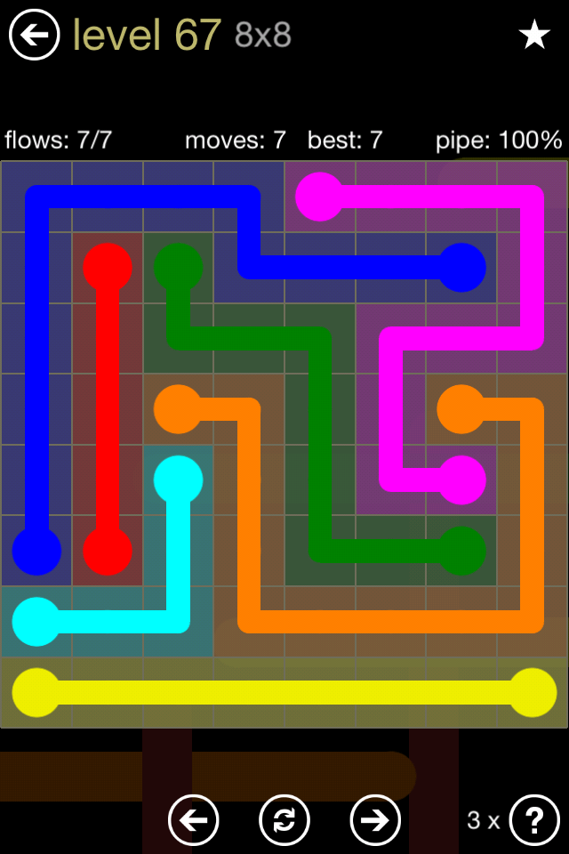 The game presents Numberlink puzzles: each puzzle has a grid of squares with colored dots occupying some of the squares. The objective is to connect dots of the same color by drawing 'pipes' between them such that the entire grid is occupied by pipes. However, pipes may not intersect. Difficulty is primarily determined by the size of the grid, ranging from 5x5 to 15x15 squares. The game also contains additional paid packs as well as a time trial mode.[2][3] Whenever a level is completed, a check mark will appear on the level select icon to indicate that the puzzle is solved, while a star indicates that the player finished the puzzle with the least number of moves required.